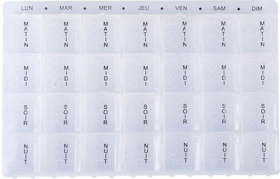 Boîte à pilules / boîte à médicaments adaptée pour 7 jours. Cette boîte à médicaments comporte 28 compartiments étiquetés comme suit : matin, après-midi, soir, nuit. Ces compartiments sont répartis sur les jours du lundi au dimanche en français.