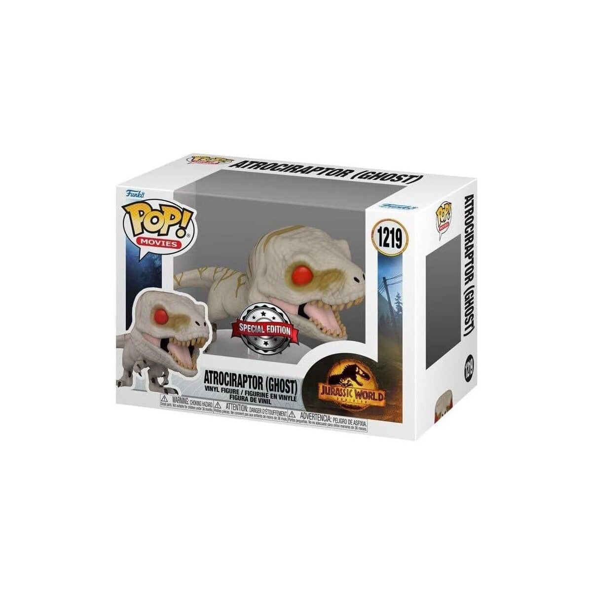 Figurine POP! Jurassic Park, modèle Atrociraptor (Ghost) Exclusive 9 cm.Figurine en vinyle taille env. 9 cm, en emballage boîte-fenêtre.