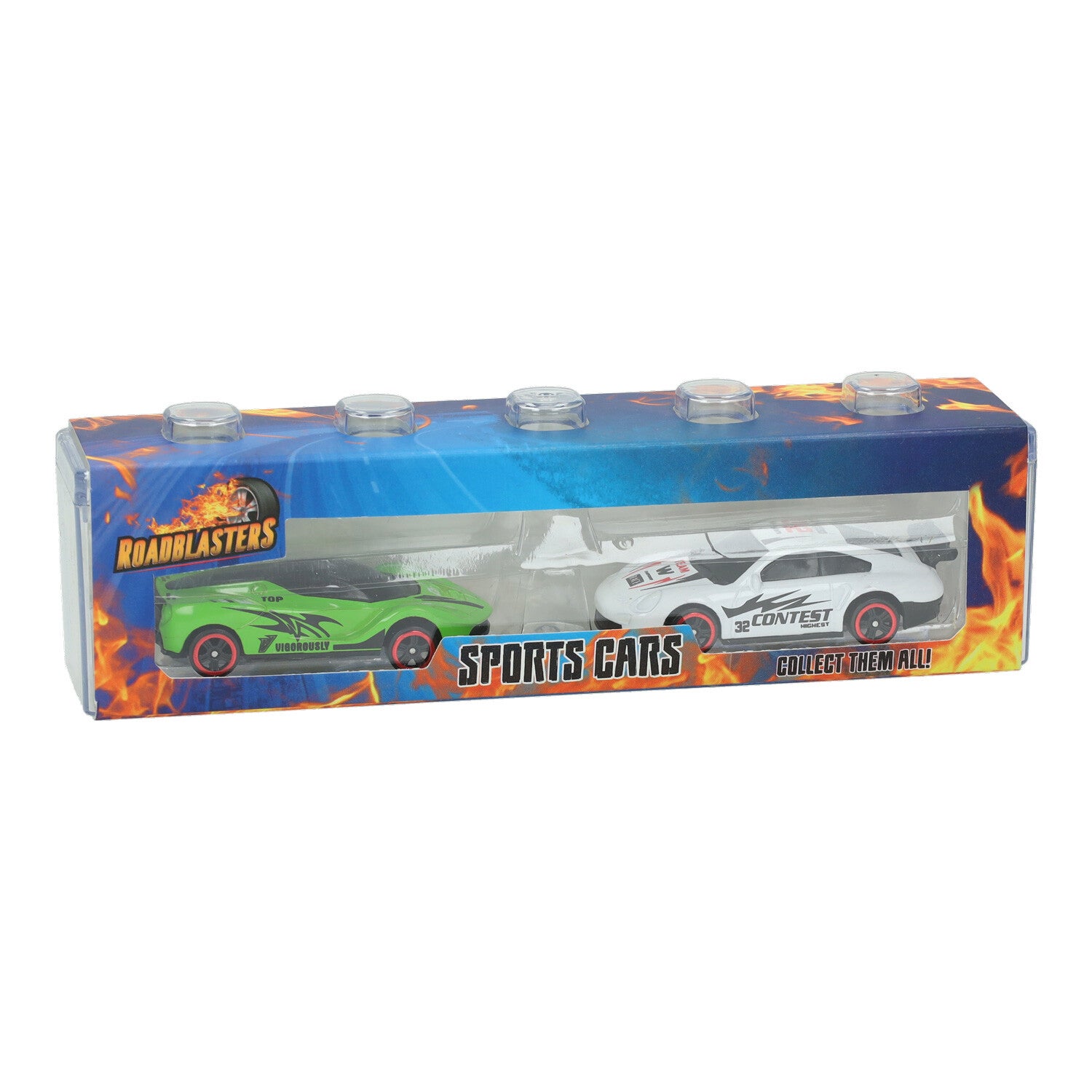 Ensemble Roadblasters de 2 voitures de course moulées sous pression dans une boîte de rangement transparente. Dimensions de la voiture : 7 centimètres. Convient à partir de 3 ans. Prix par pièce, différentes versions/couleurs sont livrées ensemble.