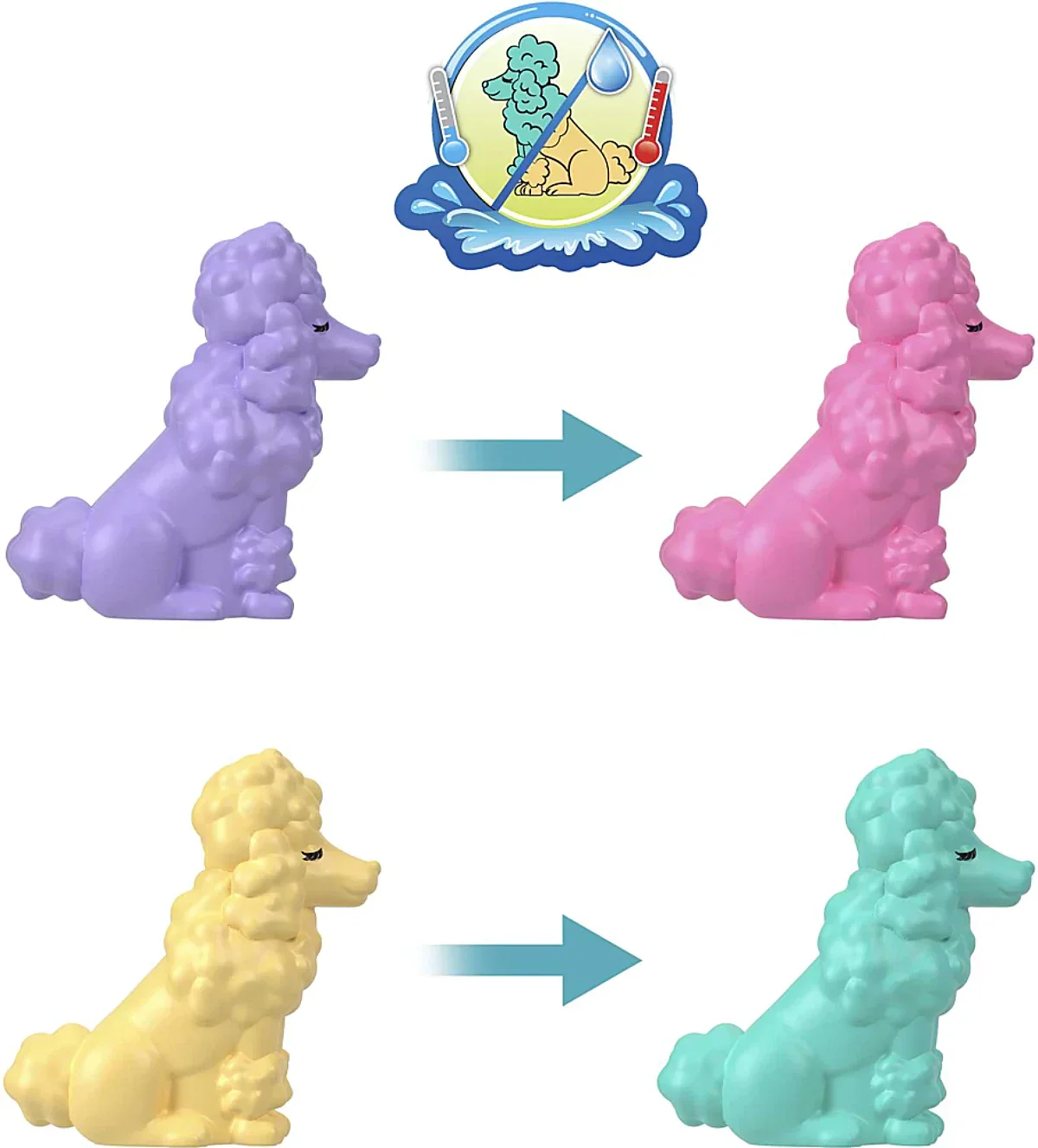 - Les possibilités de jeu sont infinies avec 12 accessoires de soin et 8 éléments interactifs, dont des caniches qui changent de couleur, une baignoire pour chien et des fauteuils pivotants de toilettage !
