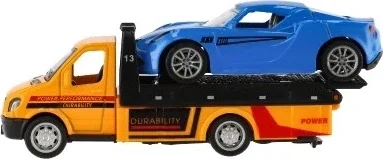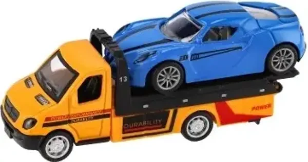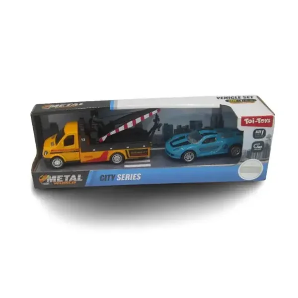 Un petit camion de dépannage puissant, accompagné d'une voiture miniature, fera le bonheur de tous les petits conducteurs. Grâce à son mécanisme à rétrofriction , les véhicules se détachent tout seuls. Sa construction en métal et plastique garantit durabilité et finitions soignées, et sa taille compacte de 11 cm est idéale pour jouer à la maison ou en voyage .