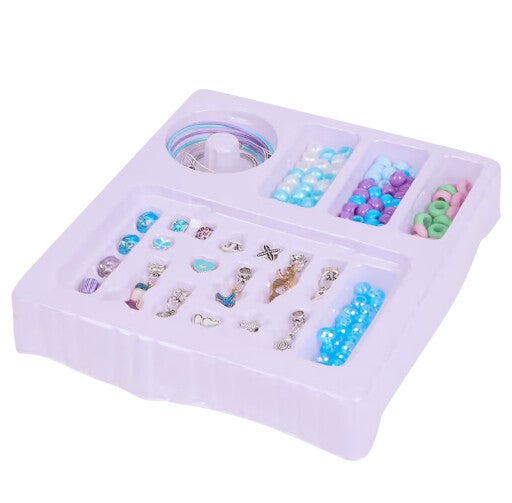 Ce kit de création de bijoux permettra à votre enfant de confectionner des bracelets uniques grâce aux perles et breloques incluses. Le choix des éléments rendra chaque bracelet unique. Laissez votre enfant imaginer le style de ses bijoux préférés. Le kit comprend des cordons avec fermoirs pour former la base, des perles colorées et des breloques sur le thème marin (coquillages, sirènes). C'est le kit idéal pour les enfants.