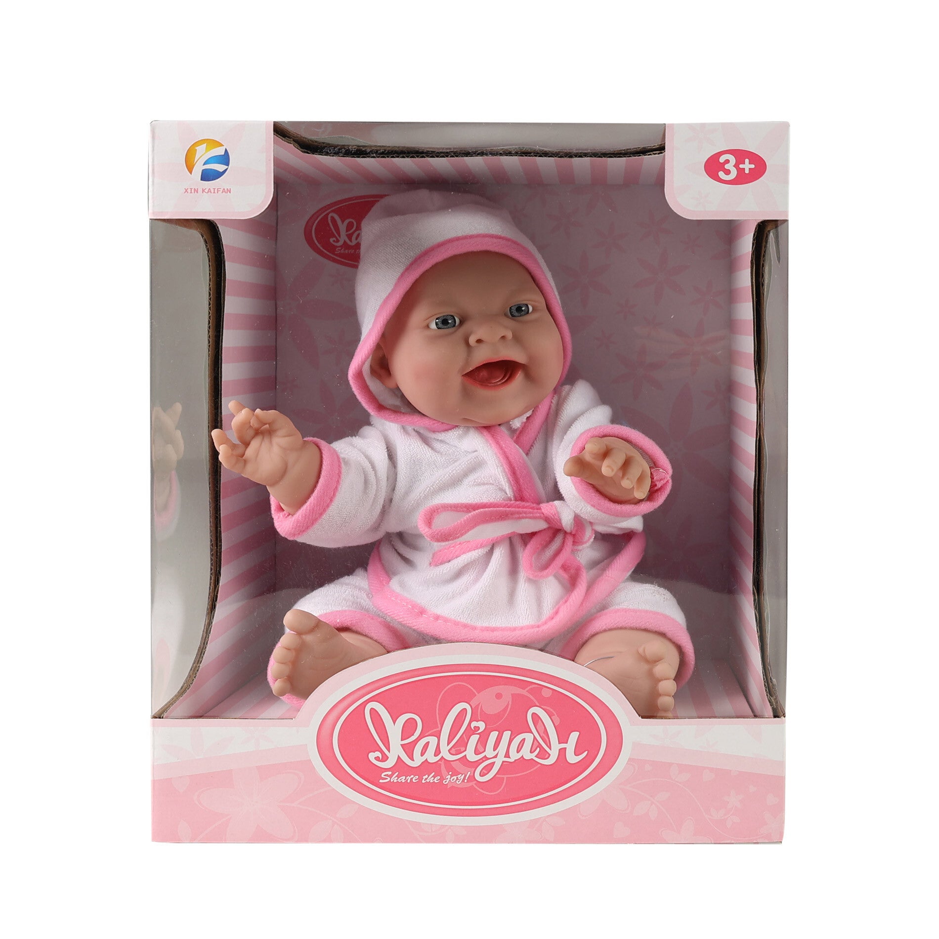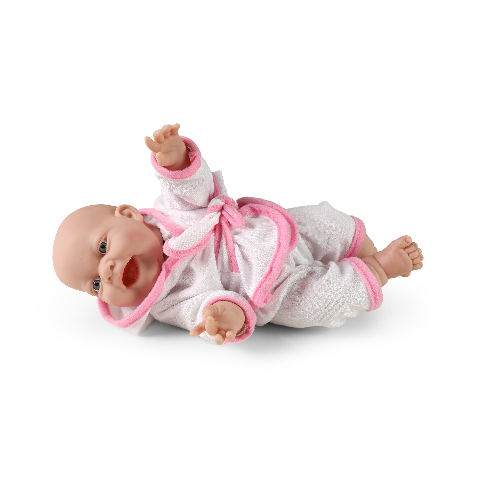 Poupée bébé en peignoir blanc et rose avec pantalon. Taille 38 cm.